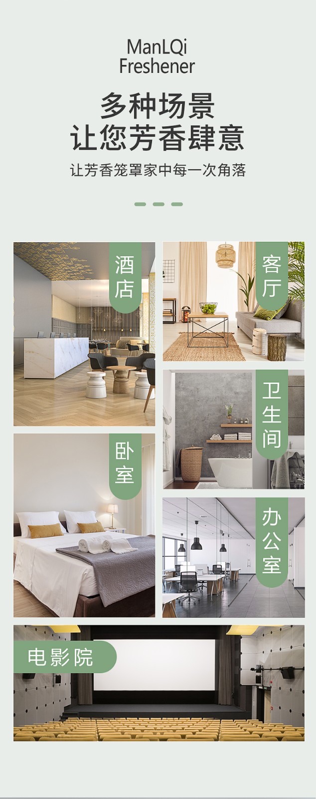 適用范圍:家庭、企事業(yè)單位、贈(zèng)品、福利(備有禮品裝)、辦公室、衛(wèi)生間、星級(jí)酒店、賓館、娛樂場(chǎng)所、寫字樓、美容院、攝影樓、火車、汽車車廂、候車室、會(huì)議室、大廳、工廠、醫(yī)院、夜總會(huì)、寫字樓、桑拿城、營(yíng)業(yè)廳、咖啡廳、茶酒樓、接待室、網(wǎng)吧等健身娛樂中心等人口密集和需要增添清香的地方。